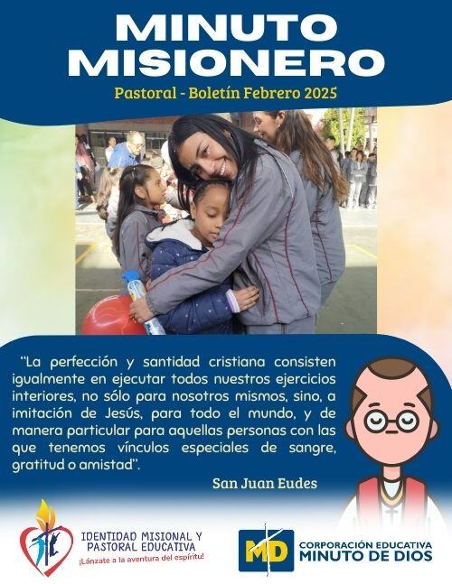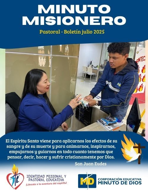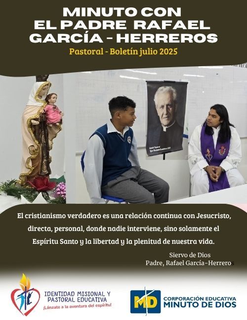 A su vez, la Pastoral Educativa permea el accionar de las diferentes Instituciones de los Colegios Minuto de Dios con la Espiritualidad eudista, asumida desde la propuesta del Siervo de Dios Rafael García Herreros con el fin de renovar el compromiso bautismal experimentado mediante la proyección y compromiso social concreto basado en el servicio y la solidaridad con los más vulnerables.